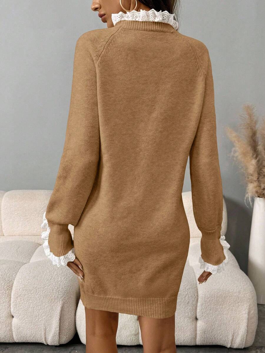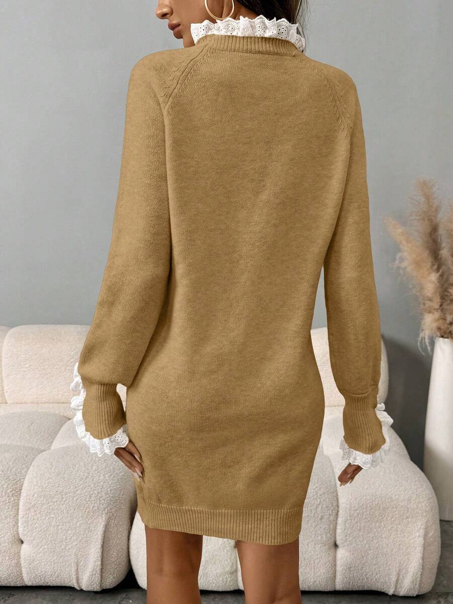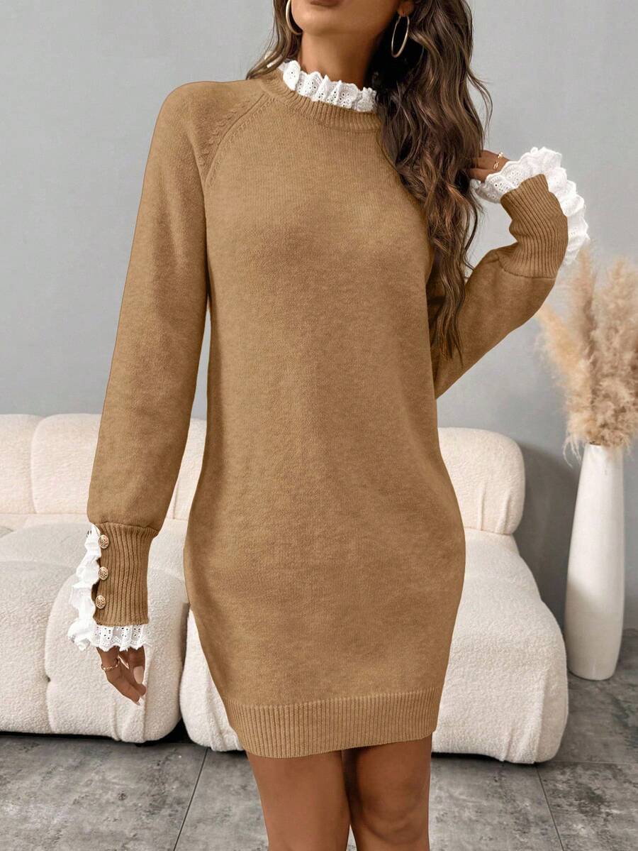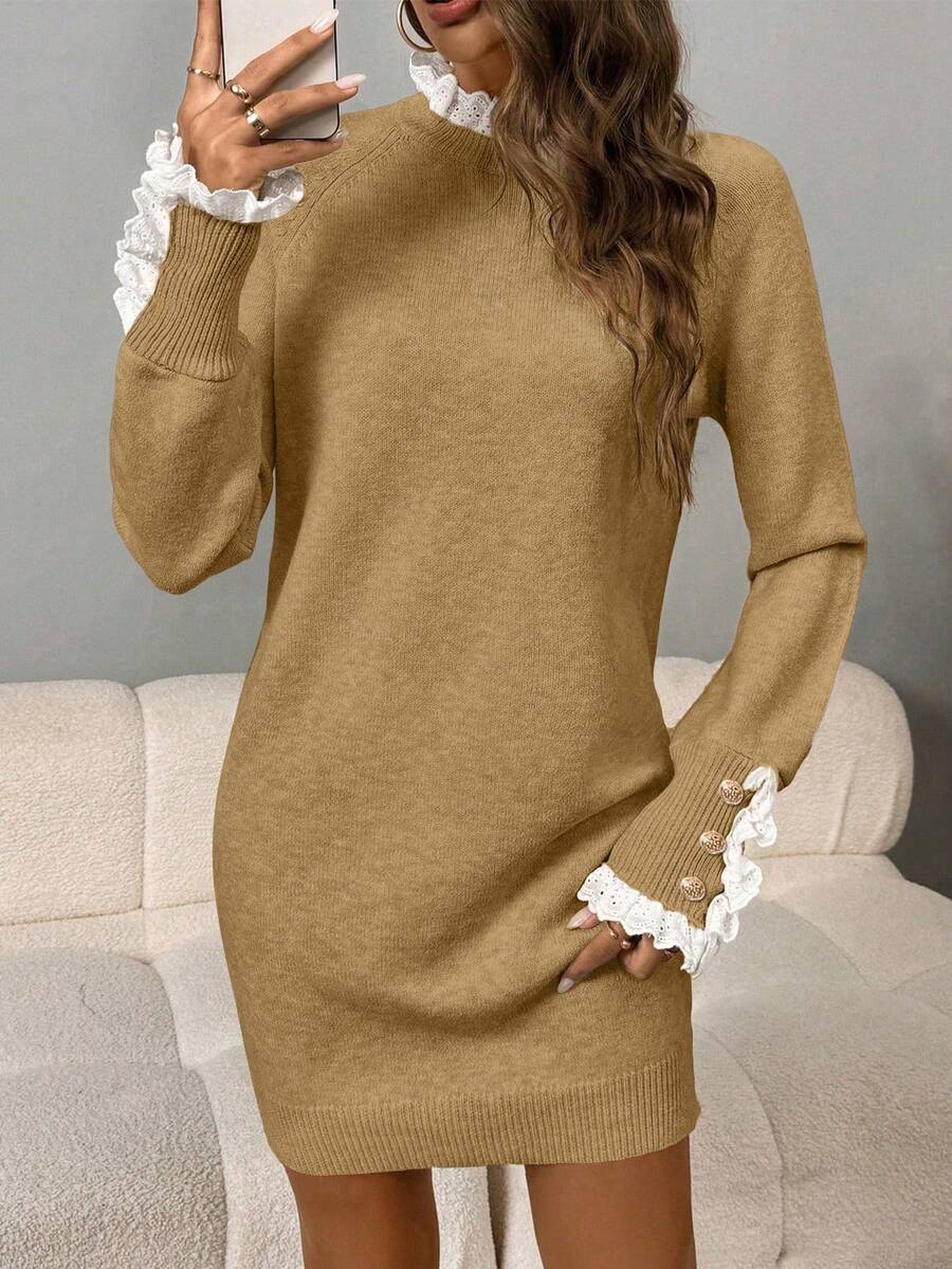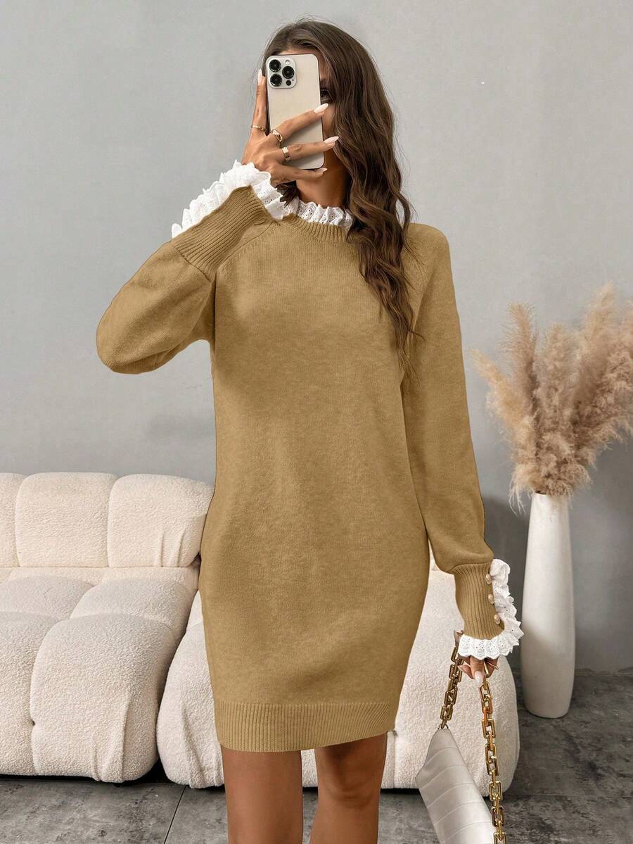SHEIN LUNE Casual beige bloemenkanten lange mouwen trui jurk, herfst/w – Tout Pour Vous