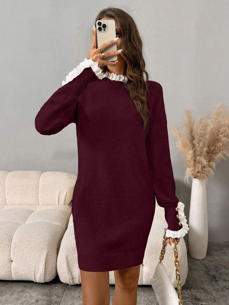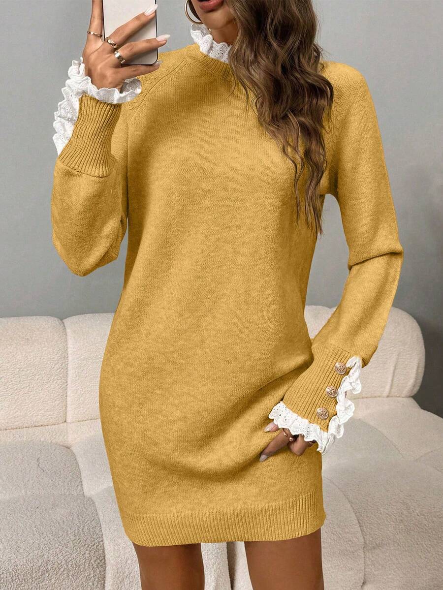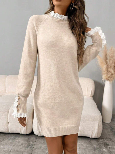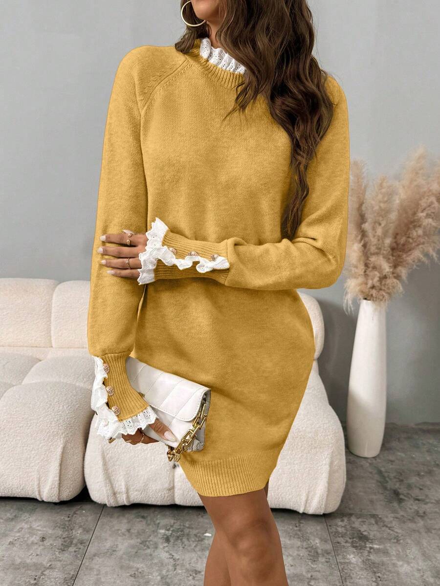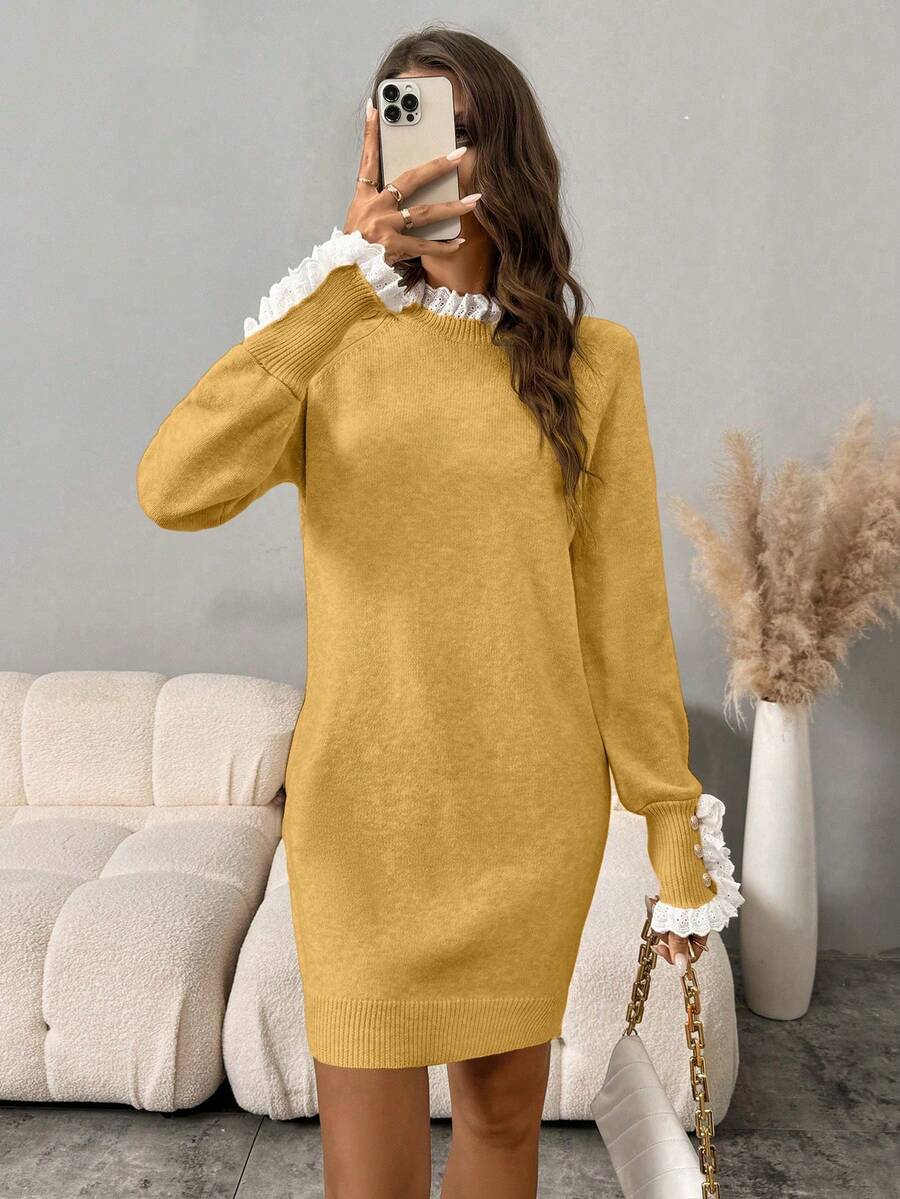 SHEIN LUNE Casual beige bloemenkanten lange mouwen trui jurk, herfst/w – Tout Pour Vous