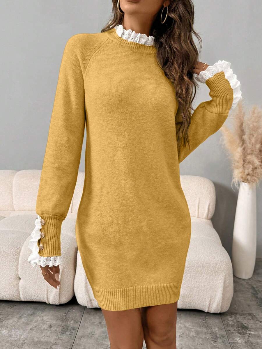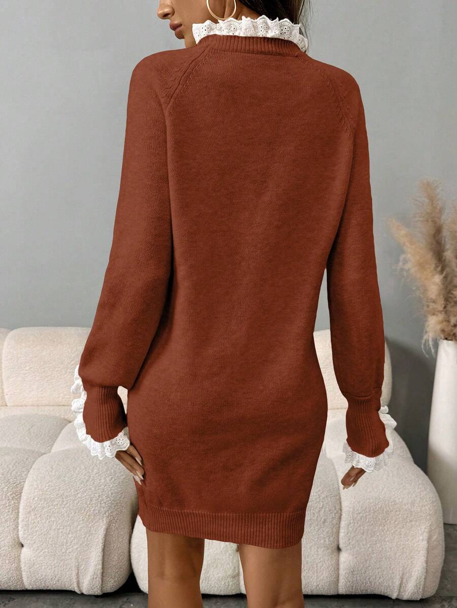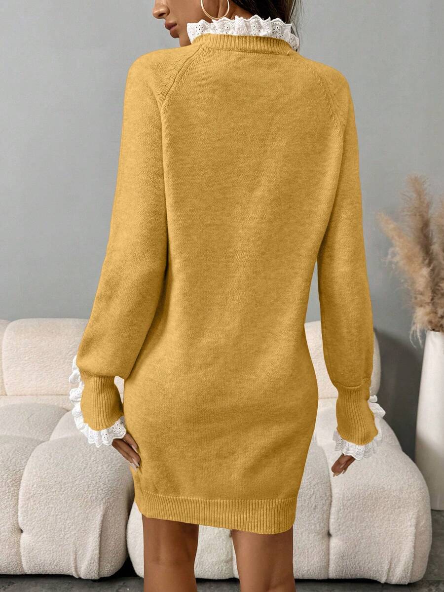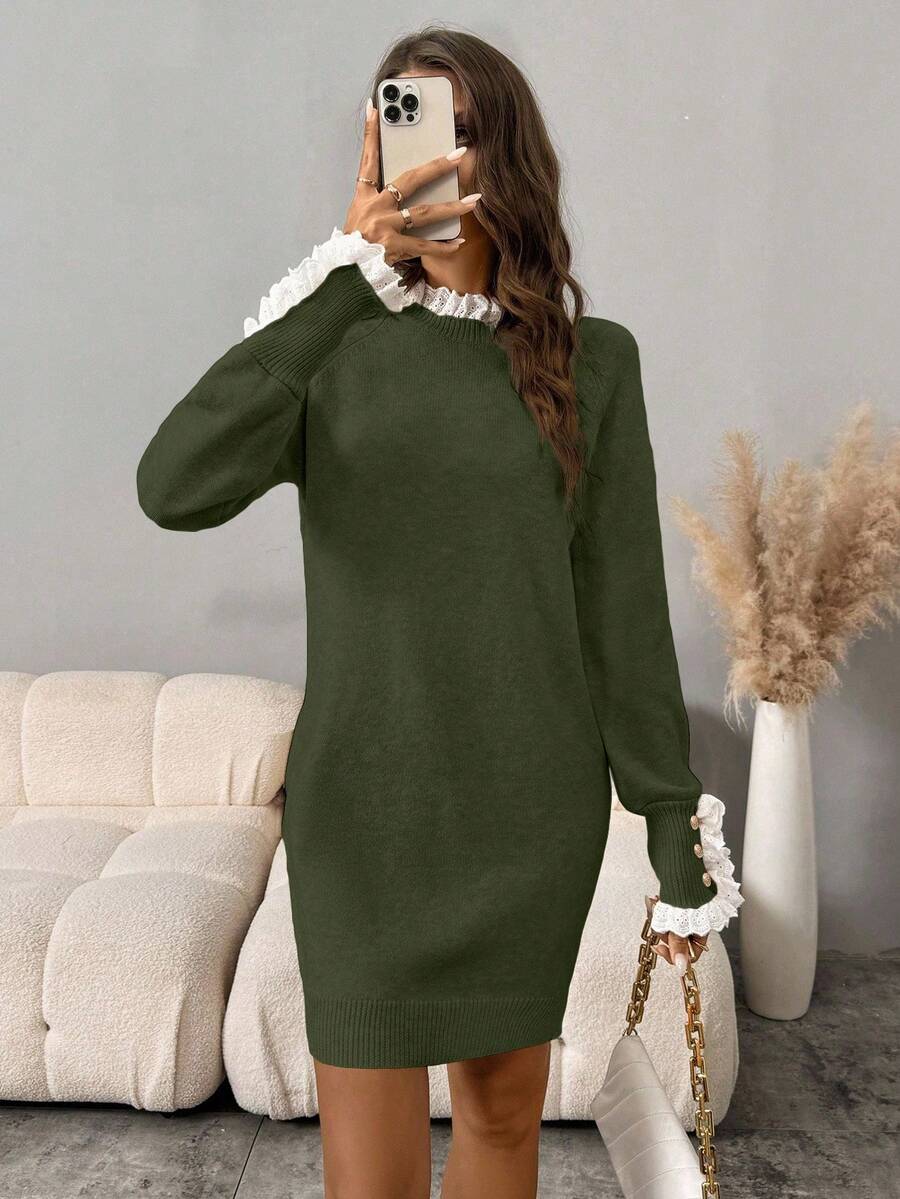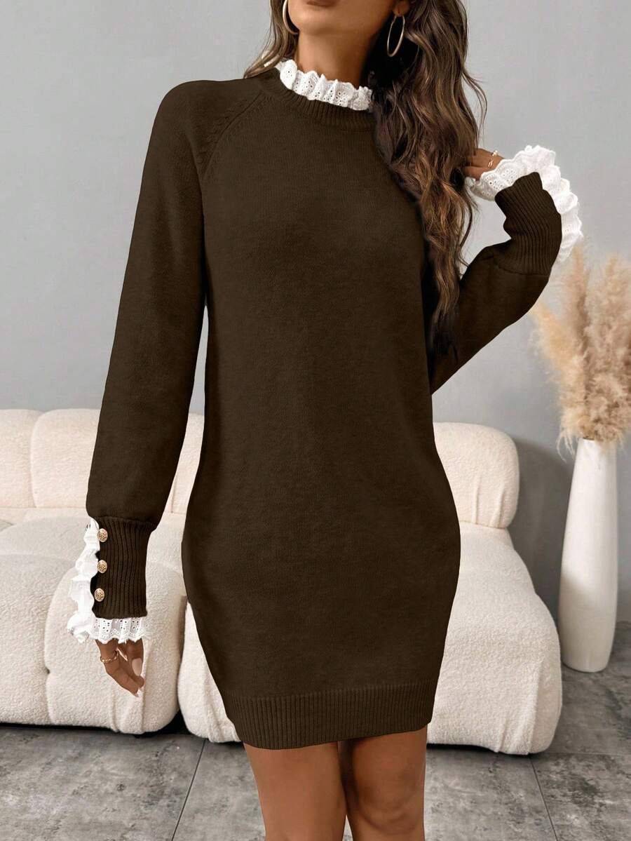 SHEIN LUNE Casual beige bloemenkanten lange mouwen trui jurk, herfst/w – Tout Pour Vous