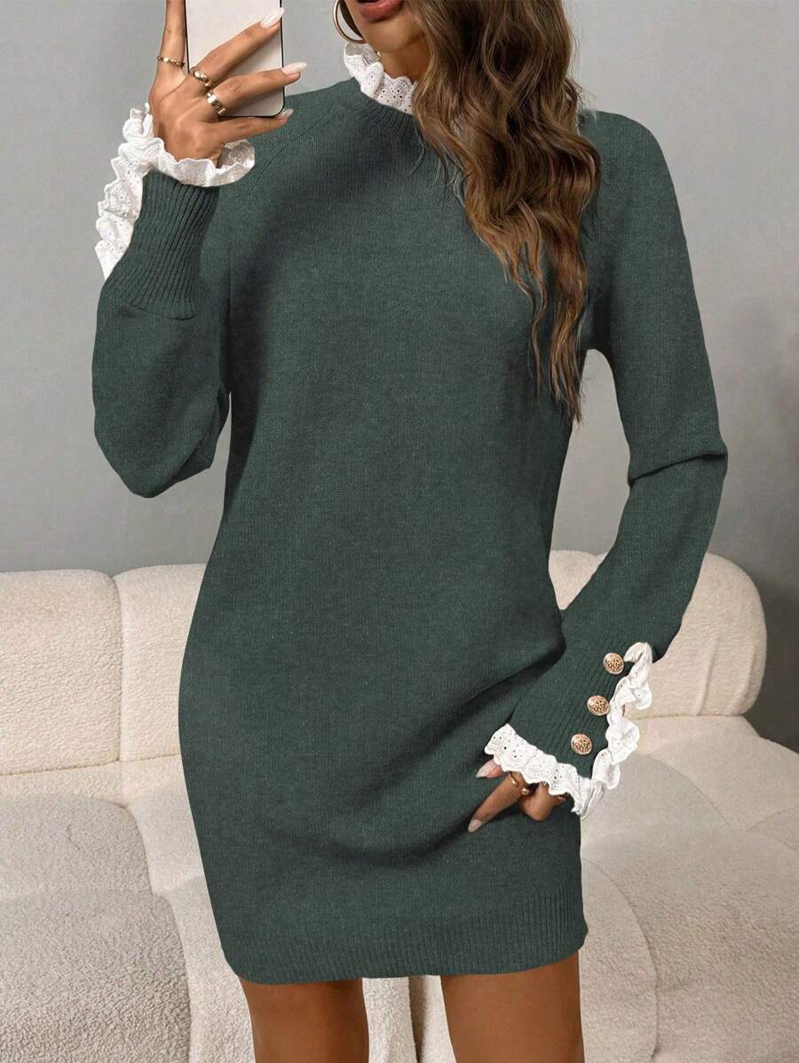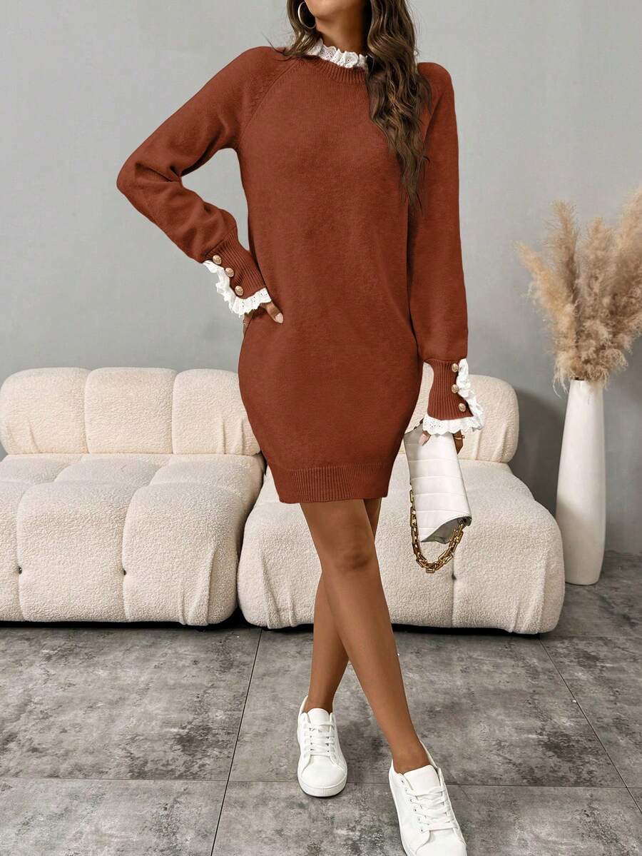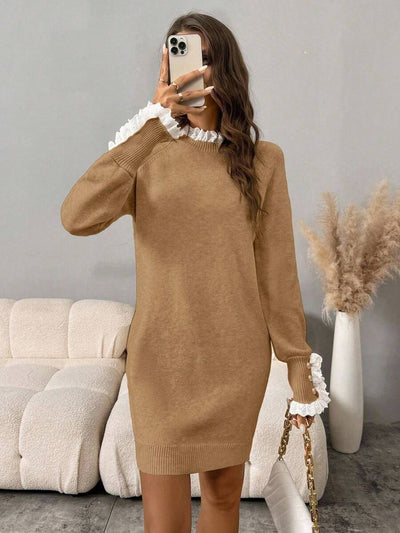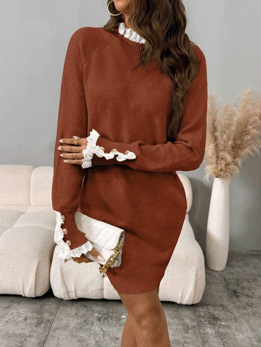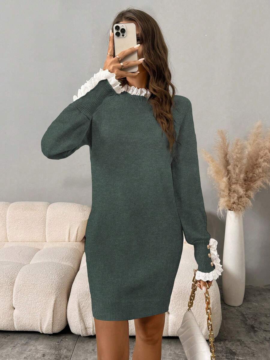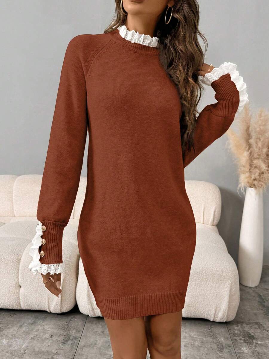SHEIN LUNE Casual beige bloemenkanten lange mouwen trui jurk, herfst/w – Tout Pour Vous