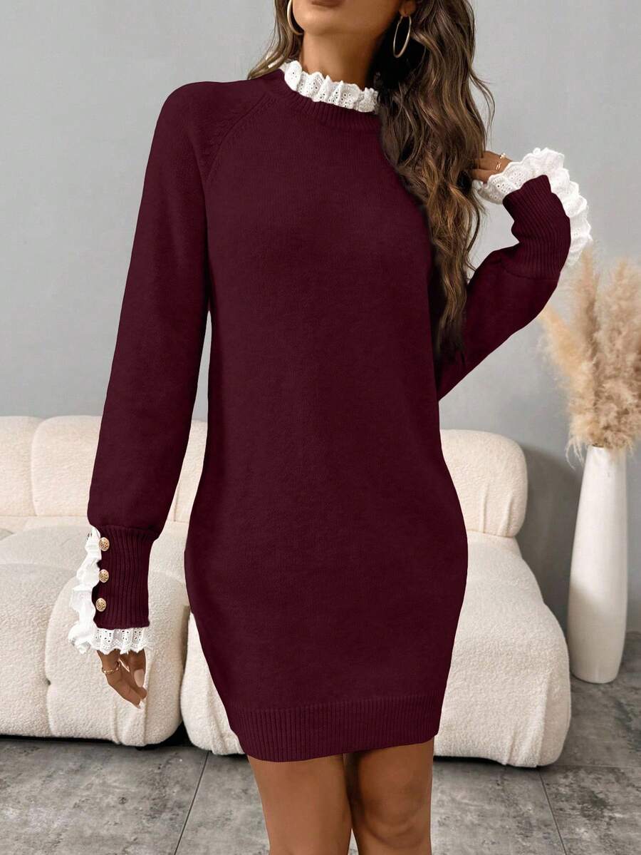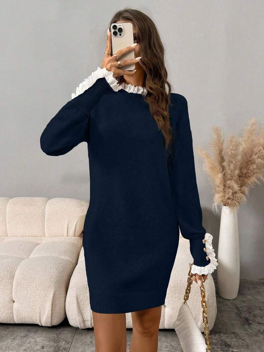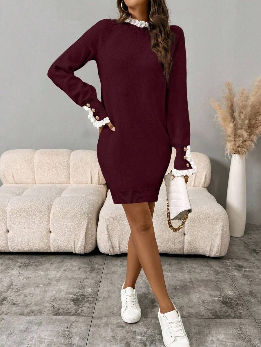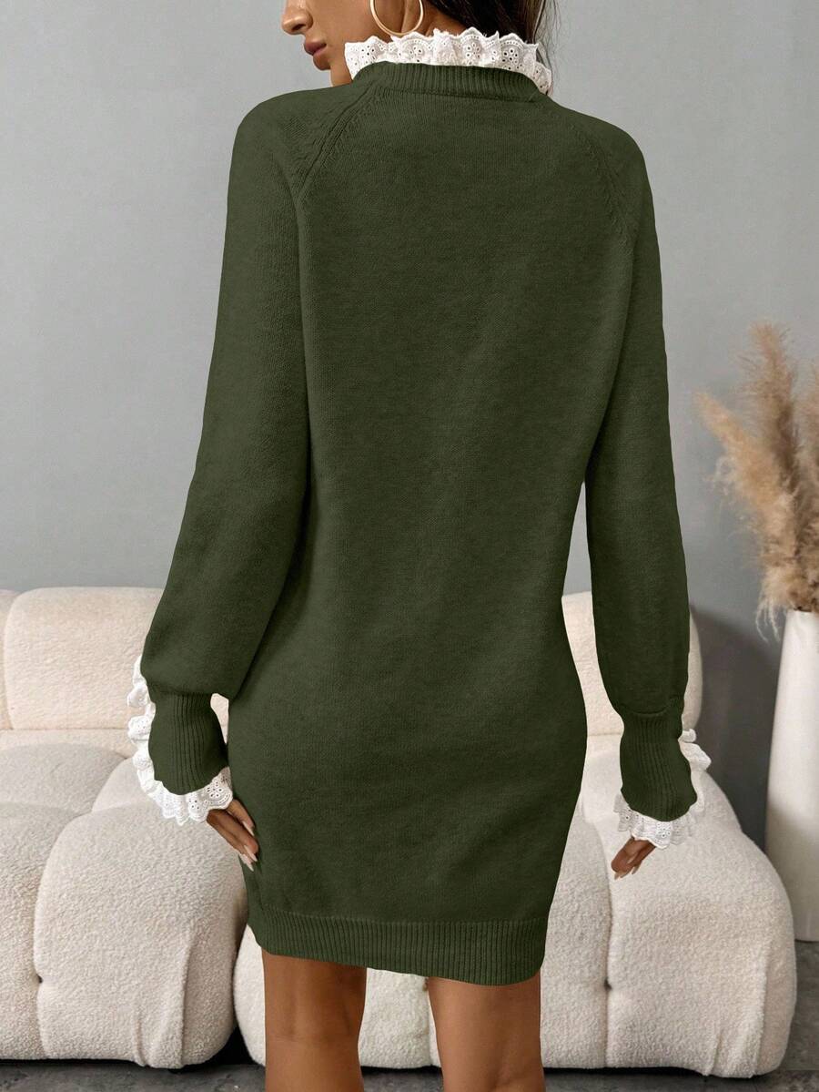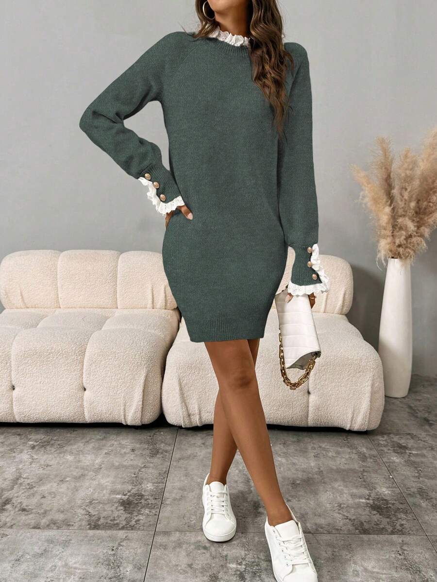 SHEIN LUNE Casual beige bloemenkanten lange mouwen trui jurk, herfst/w – Tout Pour Vous