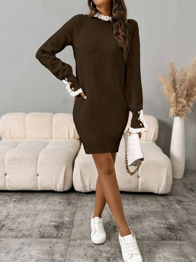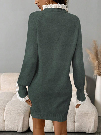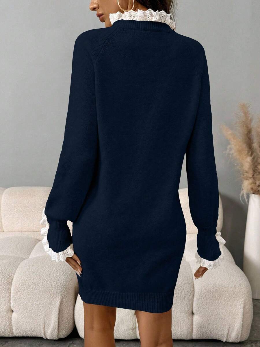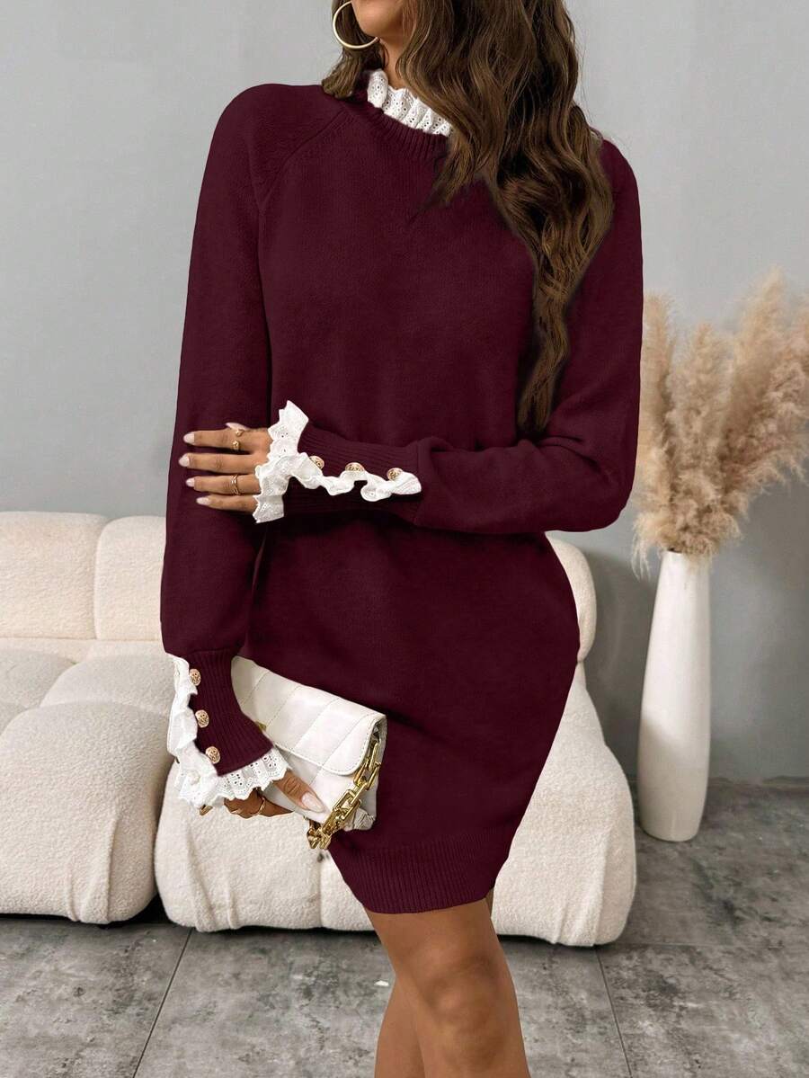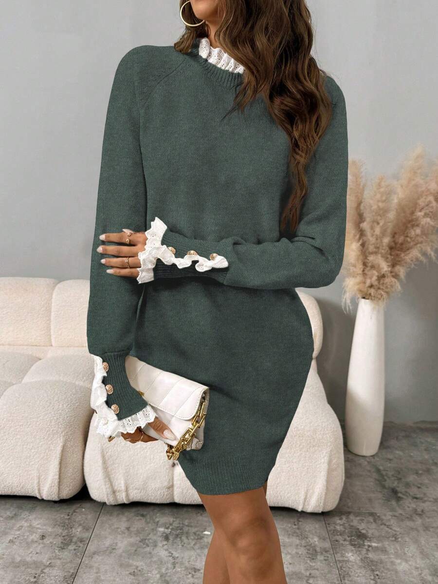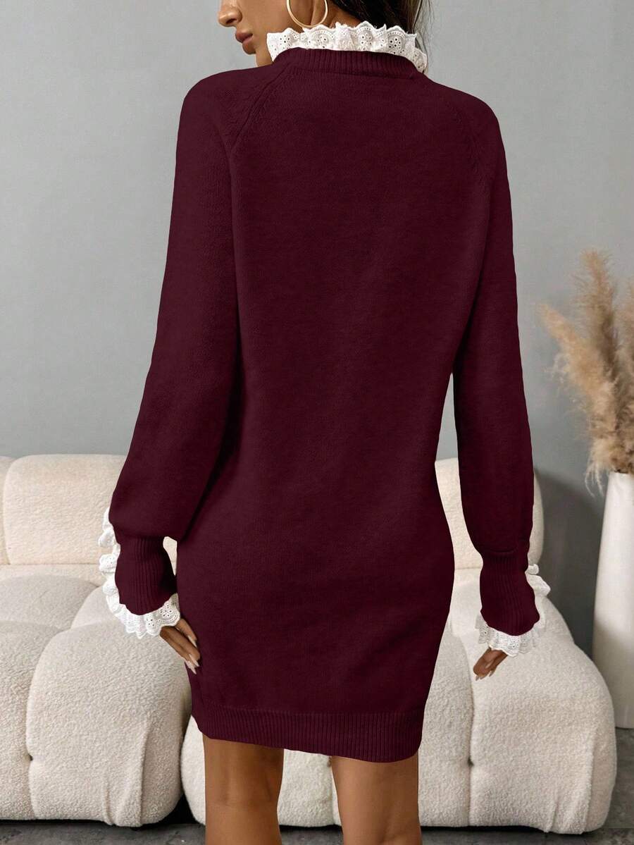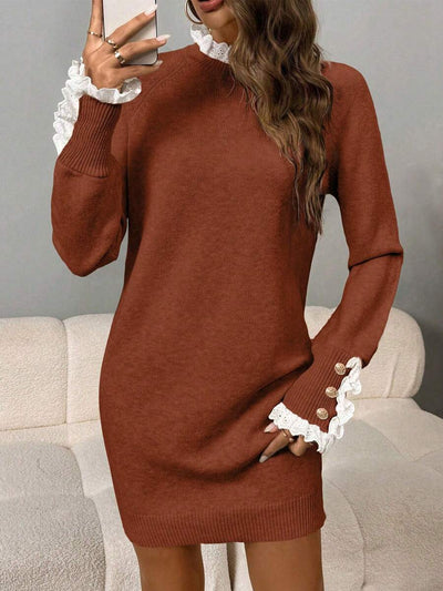SHEIN LUNE Casual beige bloemenkanten lange mouwen trui jurk, herfst/w – Tout Pour Vous